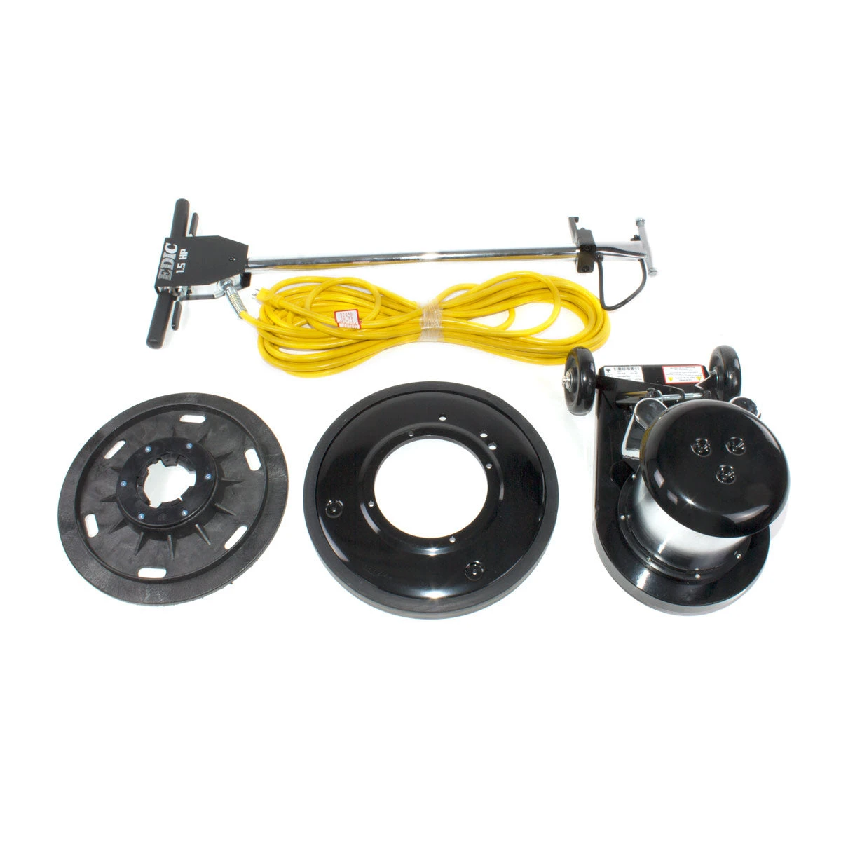 This 1.5 HP floor buffing swing machine by EDIC, is a top of the line commercial buffer that can be used for stripping, scrubbing, buffing and carpet bonneting. The EDIC Saturn™ Super Value floor buffer comes standard with a 1.5 horsepower motor and a triple planetary transmission that power this floor buffer through the toughest jobs. Never before has carpet bonneting and scrubbing been so easy. With the dual capacitors utilized during start up, this swing machine can start up under extreme stress, like that found while in carpet scrubbing industry. Not only can this floor buffing swing machine scrub carpet, but it can also scrub, buff, and strip any type of commercial floor.
